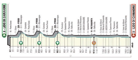 Prima parte di corsa caratterizzata da un circuito di circa 23 km, da ripetere tre volte, con la scalata di Monte Pitoro (2,7 km al 7,4%); finita la parte più difficile della tappa il plotone percorrerà l’altro circuito in programma di 29 km che si snoda tra Lido di Camaiore e Pietrasanta.
