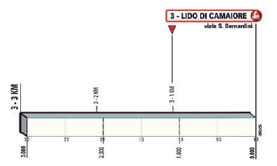 Sempre a Pietrasanta, al km 107, è posto l’unico sprint della giornata; il finale è completamente pianeggiante verso Lido di Camaiore che oltre ad essere la tappa inaugurale della “Corsa dei Due Mari” è stata spesso teatro di arrivi del Giro d’Italia.