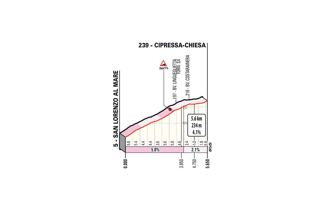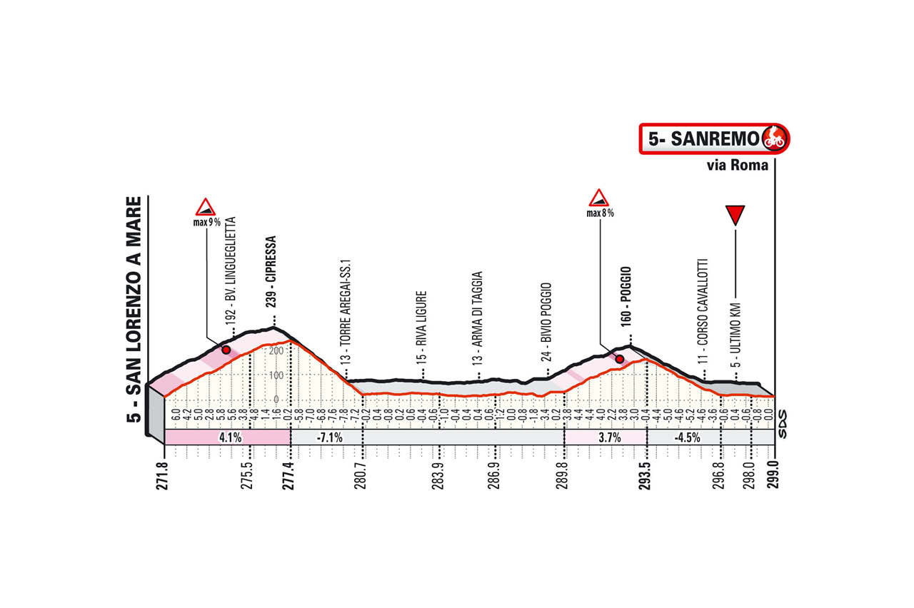 Ritmo che resterà elevato lungo il tratto pianeggiante tra Imperia e San Lorenzo al Mare in cui assisteremo ad una vera e propria volata in testa al gruppo per iniziare davanti la Cipressa (5,6 km al 4%) e dove qualche ruota veloce potrebbe staccarsi. Discorso analogo per Il Poggio (3,6 km al 3,7%) teatro di attacchi che hanno deciso la corsa.