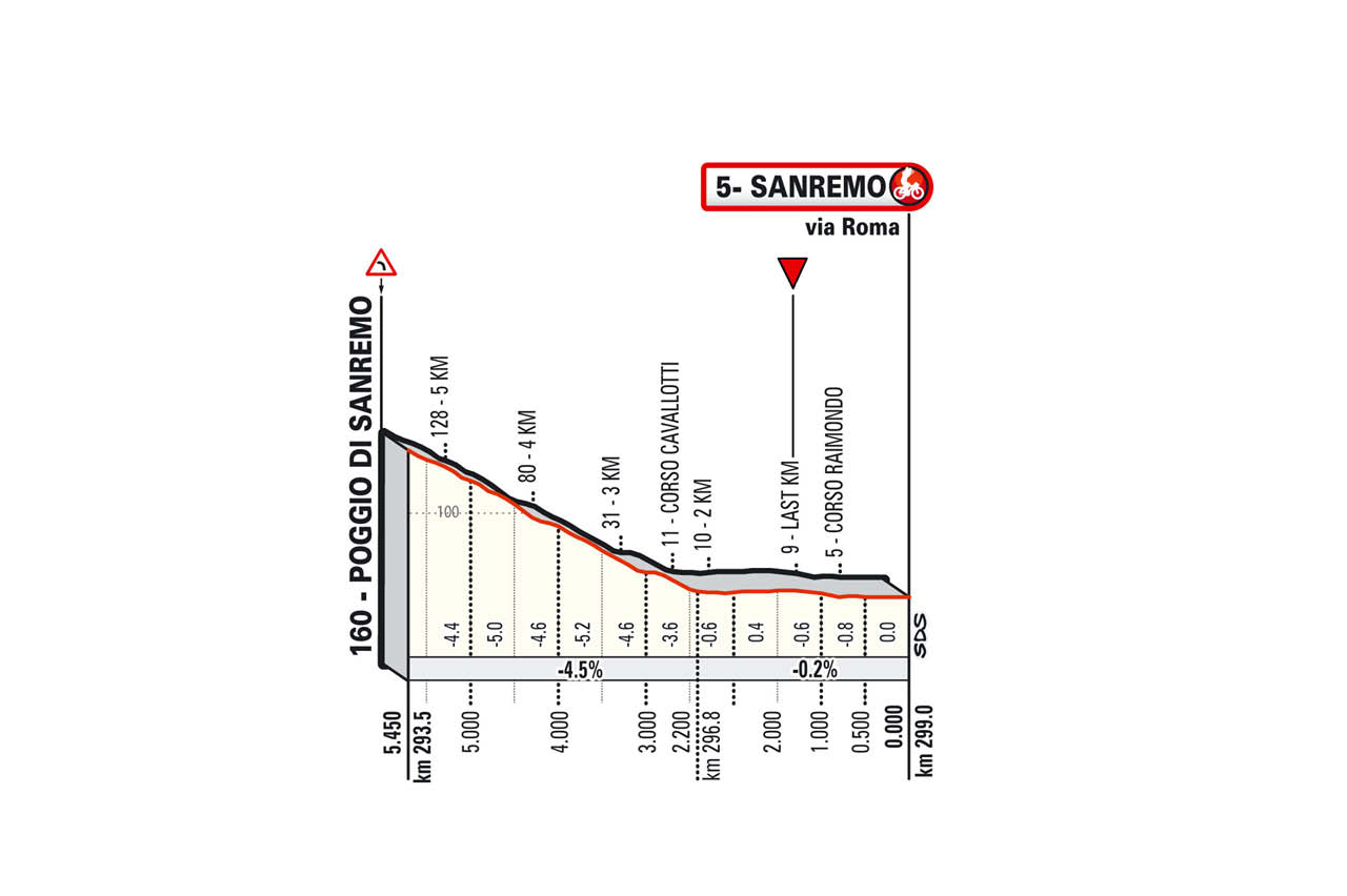 La discesa è molto impegnativa, ristretta in alcuni passaggi, con e un susseguirsi di tornanti e di curve e controcurve fino all’immissione nella statale Aurelia. L’ultima parte della discesa si svolge nell’abitato di Sanremo; ai meno 850 m dall’arrivo una curva a sinistra su rotatoria e ai 750 m dall’arrivo l’ultima curva che immette sulla retta finale di via Roma.