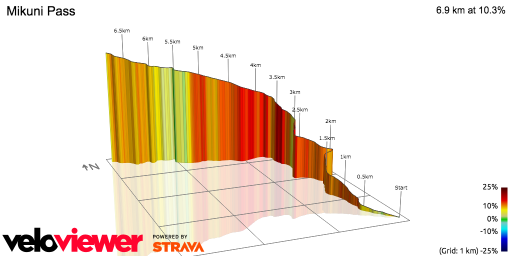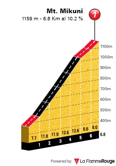 Il Mikuni Pass è la salita più dura del percorso che misura 6800 metri alla pendenza media del 10,2%; il tratto più duro i corridori lo incontreranno nella parte centrale dell’ascesa. 4 km alla pendenza media del 12,2%. Qui si può decidere la corsa anche se c’è ancora tempo per rientrare perchè prima dell’arrivo si deve transitare nuovamente sul Kogosaka Pass seguito dalla lunga discesa che porta all’arrivo.