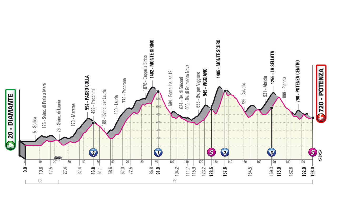 Particolare attenzione per tre frazioni molto interessanti: quella di Potenza è una tappa molto mossa attraverso le montagne calabro-lucane con un dislivello complessivo degno di una tappa Dolomitica. L’avvio lungo il mare costituisce l’unica parte pianeggiante o quasi. Dopo Maratea la sequenza di asperità, più o meno impegnative, è ininterrotta. Si scala il passo della Colla che porta a Lauria dove si affronta il Monte Sirino, vecchia conoscenza del Giro che lo ritrova dopo 23 anni. Dopo l’attraversamento di Viggiano si scala la Montagna grande di Viggiano, salita inedita molto impegnativa per giungere a Potenza dopo l’ultima salita della Sellata.