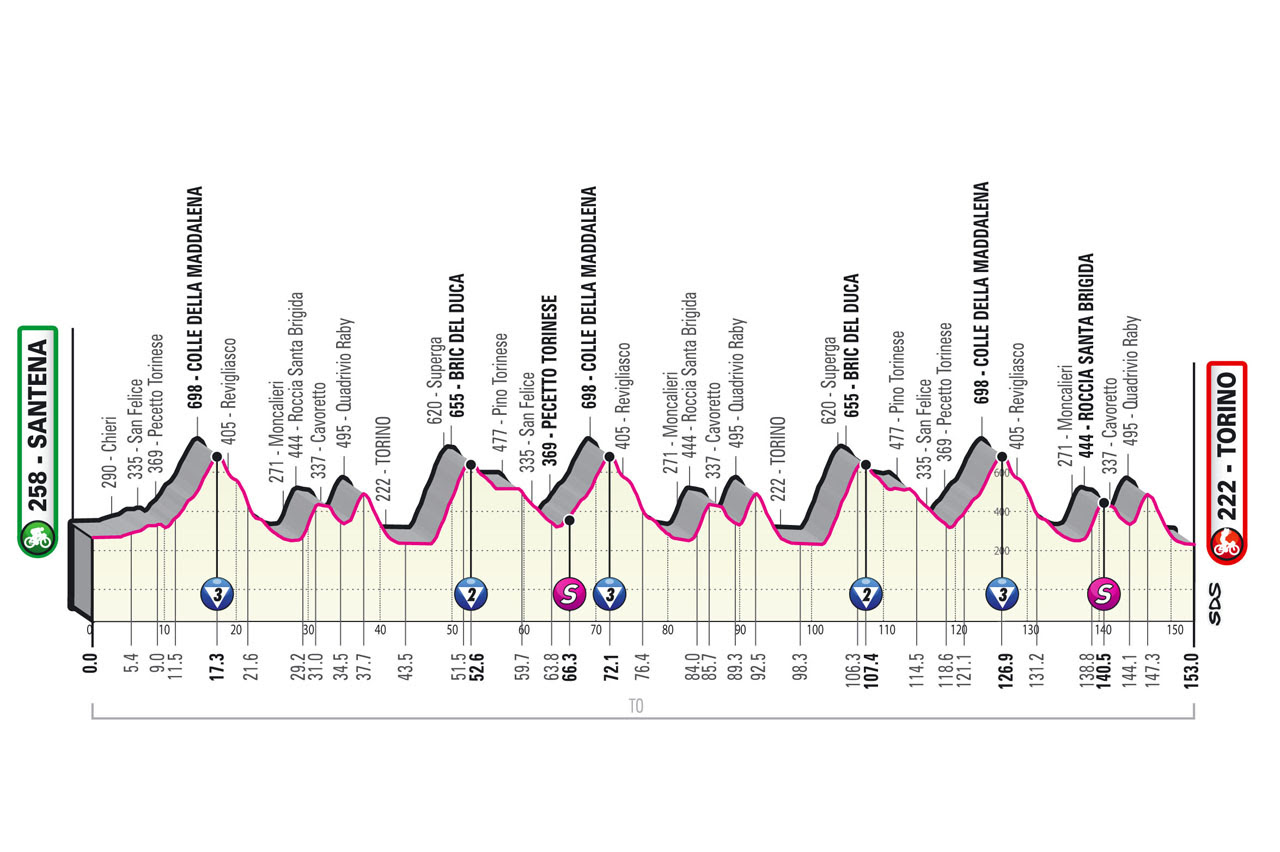 La frazione con arrivo a Torino dal corto chilometraggio ma molto intensa senza un momento di respiro. Il dislivello complessivo se rapportato ai chilometri percorsi è quello di un tappone alpino. I primi dieci chilometri pianeggianti da Santena fino a Chieri sono gli unici senza salita o discesa. Si percorre infatti per due volte e mezza un circuito che prevede la salita al Colle della Maddalena e dopo Moncalieri lo strappo di Santa Brigida. Si passa sulla linea del traguardo alla Gran Madre e si scala la salita di Superga per giungere nuovamente ai piedi della Maddalena e ricominciare. Nel complesso si scaleranno due volte Superga e tre volte a Maddalena e Santa Brigida per un finale molto intenso.