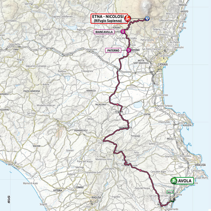 Partenza da Avola e arrivo dopo 169 km a Rifugio Sapienza in una frazione movimentata già dopo il via ufficiale; il plotone nei primi 80 km sarà impegnato in diversi saliscendi prima di 50 km di pianura che anticipano l’ascesa finale che Paolo Alberati ci presenta in anteprima.
