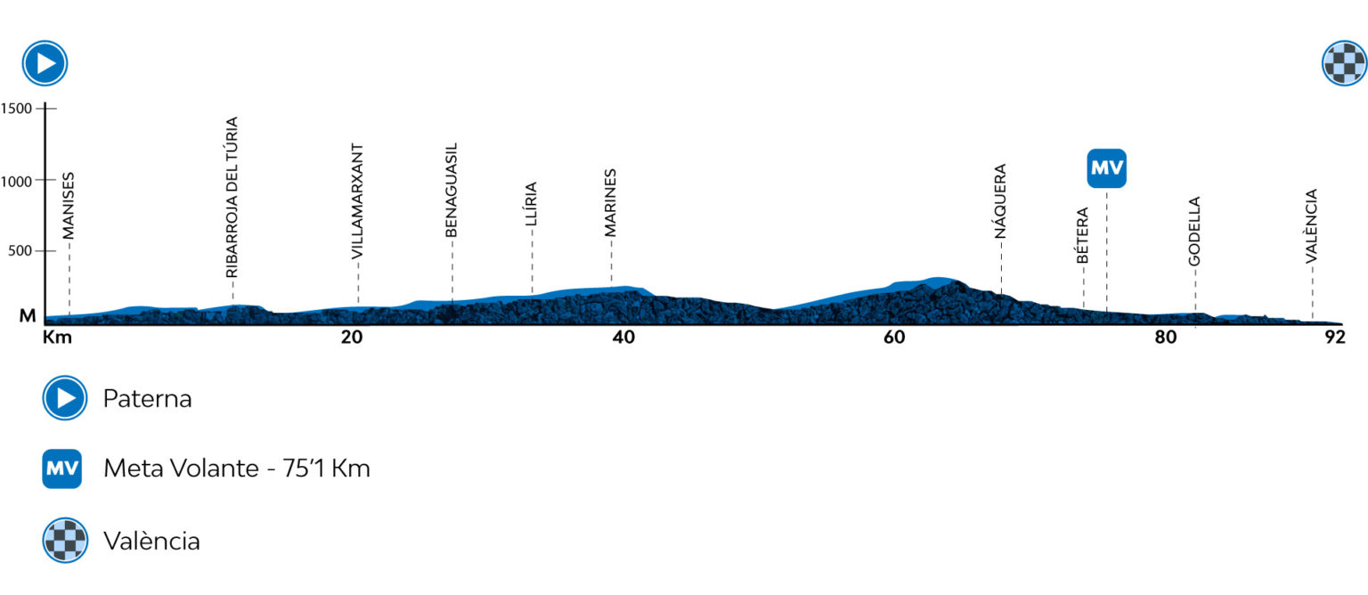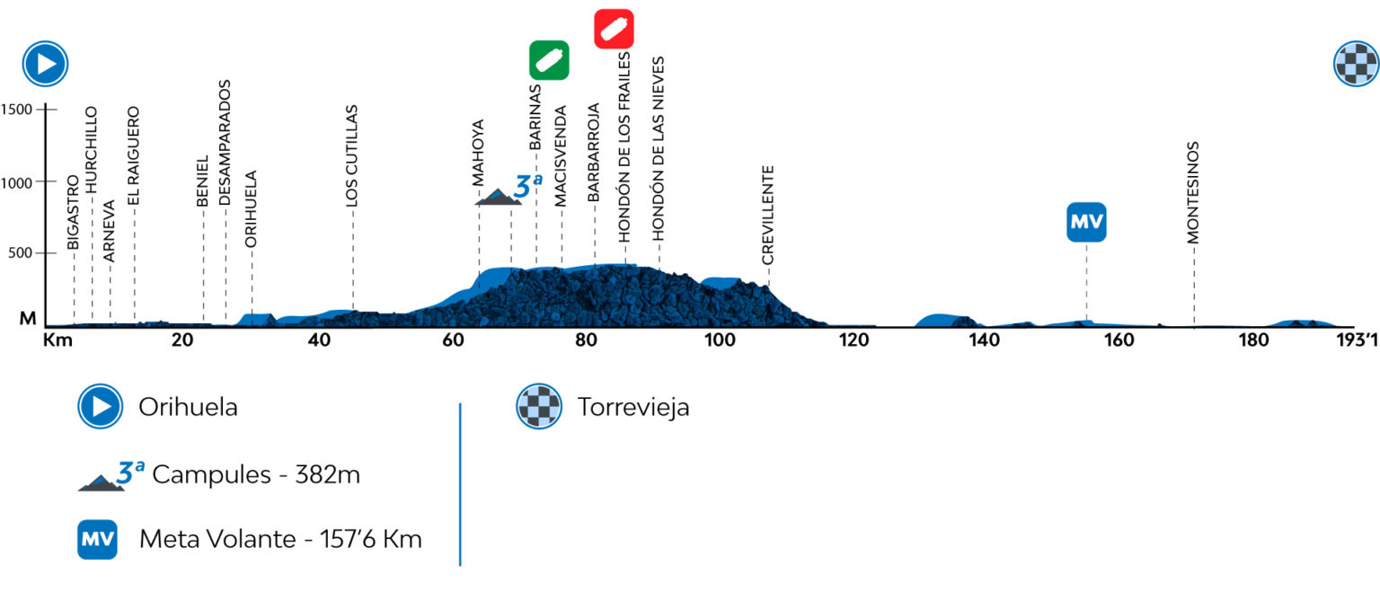 IL PERCORSO. Prima frazione, Les Alqueries – Torralba del Pinar, che prevede un finale mosso con il Collado de Ayodar (3,9 km al 5,4%) e la Torralba del Pinar (4,6 km al 6,9%) concentrati negli ultimi 20 km che rendono la frazione insidiosa. Mercoledì seconda giornata di gara,  la Bétera – Torrent, che presenta 5 GPM che non dovrebbero dare problemi alle ruote veloci che si daranno battaglia sull’arrivo di Torrent. La Alicante – Alto de Las Antenas del Maigmo Tibi è senza dubbio la tappa regina della piccola corsa a tappe valenciana che nel finale prevede l’arrivo sul Maigmo de Tibi in una salita di 9,5 km alla pendenza media del 7,5% che prevede anche un tratto in sterrato di 1800 metri; gli ultimi 5500 metri rappresentano la parte più dura dell’intera ascesa con una pendenza media del 10,2%. I big della classifica generale potranno rifiatare venerdì in quella che sarà la tappa più lunga della corsa di 193 km con partenza da Orihuela e arrivo a Torrevieja dove i velocisti non si faranno sfuggire la grossa occasione di uno sprint a ranghi compatti prima di concludere la corsa con la passerella finale di 91 km con arrivo a Valencia.