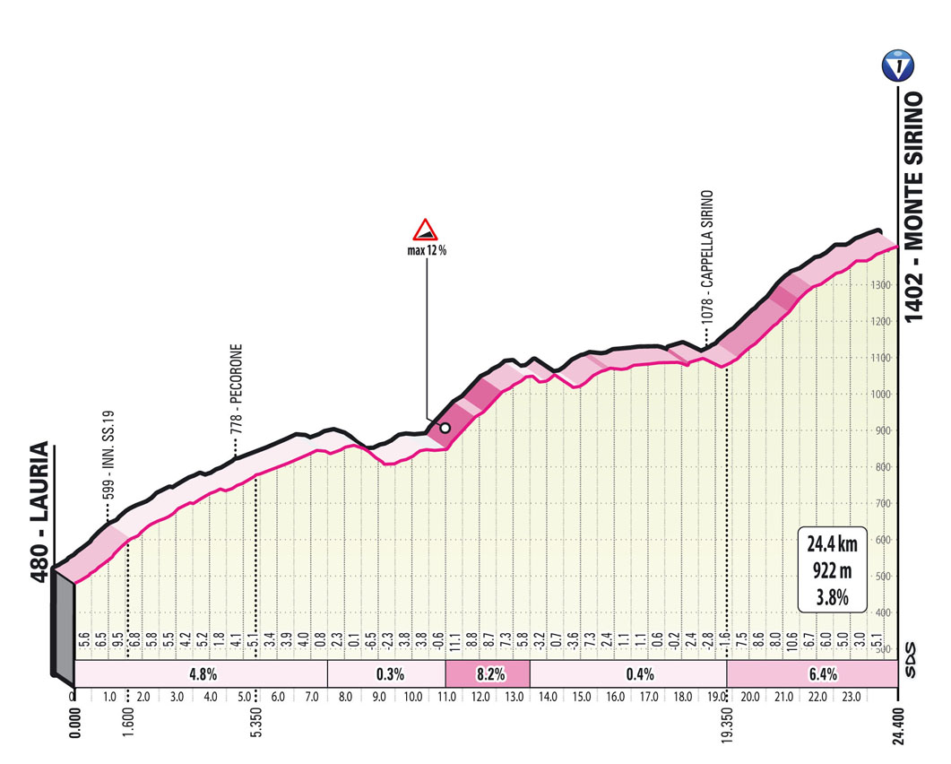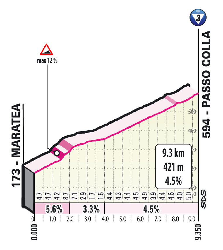 Settima tappa del Giro d’Italia (2.UWT) con una frazione impegnativa di 196 km e ben 4510 metri di dislivello e ben 4 GPM; una tappa che concederà al gruppo poca pianura con partenza da Diamante e arrivo a Potenza.