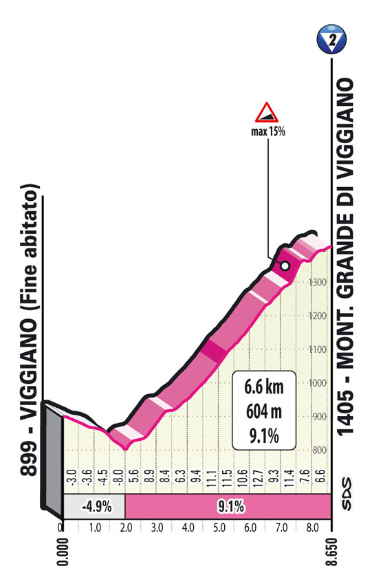 Dopo la discesa piccolo tratto in pianura che dirigerà il plotone al Bivio per Viggiano dove inizia una breve salita verso il primo traguardo volante di Viggiano (4300 metri al 6,7%); brevissima discesa e si risale verso Montagna Grande di Viggiano (6,6 al 9,1%) la salita più dura della giornata.