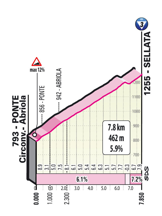 Finale altrettanto impegnativo con il Passo della Sellata (7,8 km al 5,9%), il primo passaggio da Potenza (1900 metri al 5,4%); ultimi chilometri interamente in città con la strada che sale con pendenze elevate per ridiscendere lungo viali ampi e ben pavimentati. A 2 km dall’arrivo una breve galleria porta ai viali che conducono all’arrivo e gli ultimi 350 metri all’8% con punta massima del 13%.