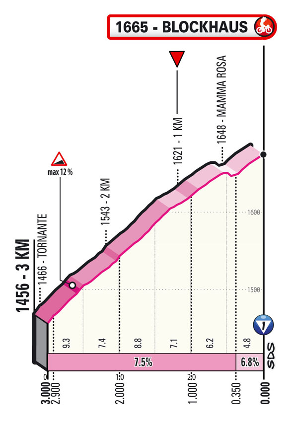 Dopo il secondo e ultimo sprint di giornata posto a Roccamorice inizia la salita finale del Blockhaus di 13,6 km all’8,4% con gli ultimi 10 km con una pendenza costante al 9,4% per una frazione che scremerà la classifica generale definendo il gruppetto di big che si giocheranno la vittoria finale della “Corsa Rosa”.