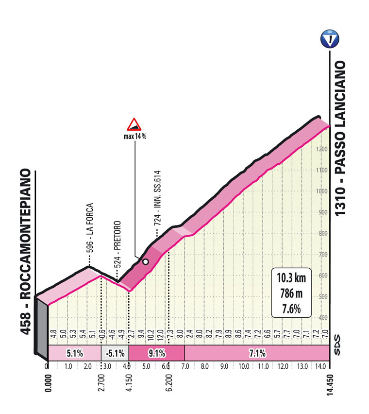 Lunga discesa prima di arrivare a Guardiagrele dove si affronta il versante più facile di 3900 metri al 5,3% che anticipa di qualche chilometro il traguardo volante di Filetto; da questo momento si inizia a fare sul serio con il Passo Lanciano (10,3 km al 7,6%) che dal km 4 al km 7 presenta una pendenza media del 9,1%.