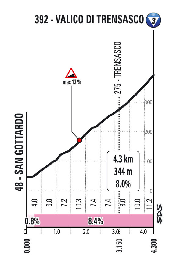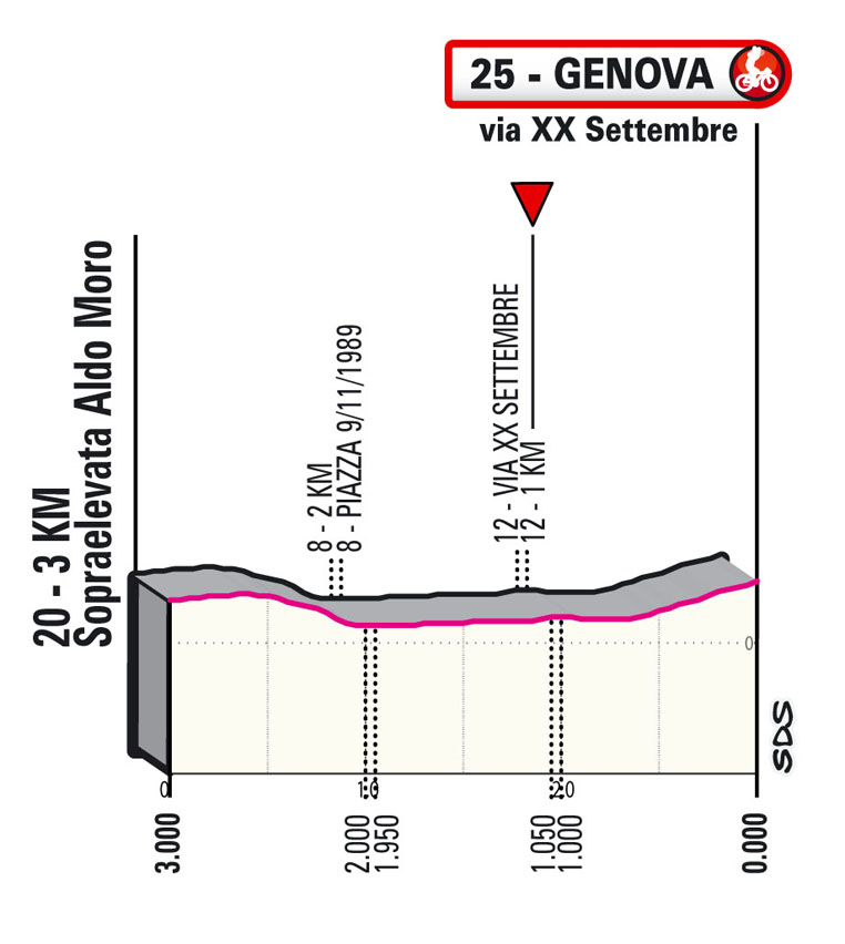 Ultimi 70 km con due salite sa affrontare La Colletta (9 km al 4,3%) e infine il Valico di Trensacco (4,3 all’8%) che presenta un pendenza massima del 12%; il finale percorre il Ponte San Giorgio per uscire a Genova Ovest (da segnalare alcune gallerie) e imboccare la Sopraelevata Aldo Moro che porta fino ai 2 km dall’arrivo. Ultimi 2 km con una curva sola (all’ultimo km) tutti in leggerissima ascesa rettilinei ampi e ben pavimentati. Retta finale su asfalto pendenza circa 2%.