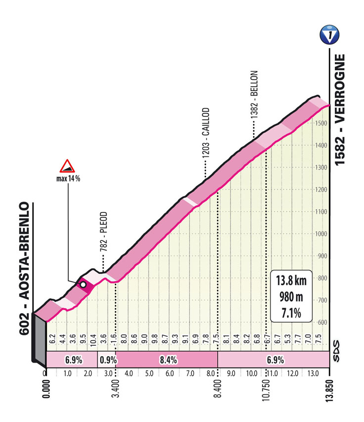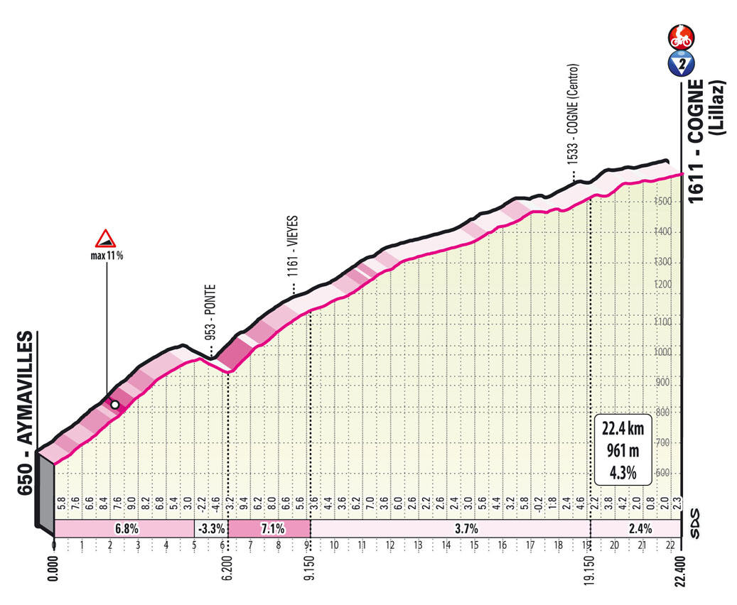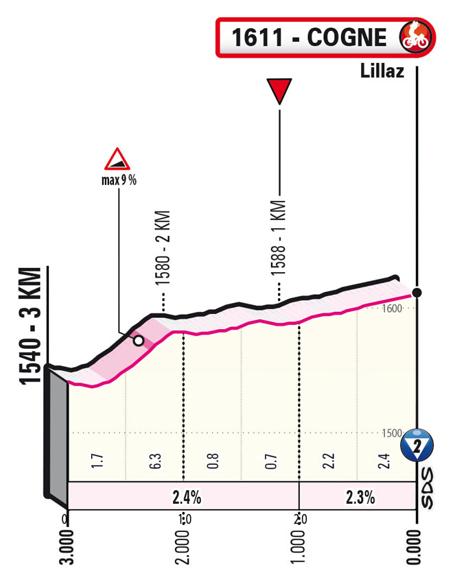 Discesa verso Aosta e si risale subito verso i 1582 metri di Verrogne (13,8 km al 7,1%) una salita impegnativa dove potrebbero arrivare i primi attacchi alla maglia rosa; discesa verso Saint Pierre e si entra nella fase finale della frazione con la salita che porta al traguardo di Cogne.
