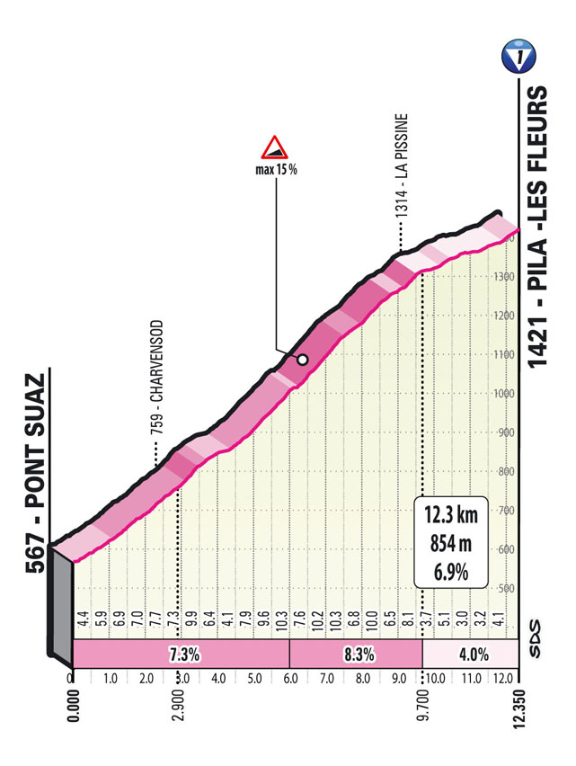 Si parte da Rivarolo Canavese con i primi 90 km conditi da qualche salitella come quella che porta a Saint Vincent (4900 metri al 4%) prima di arrivare allo sprint volante di Pollen; da qui cambia completamente il percorso con il plotone che si appresta ad imboccare la prima salita di Pila Les Fleurs (12,3 km al 6,9%) che per i primi 9700 metri di ascesa con pendenze che non scendono mai al 7,3% prima di addolcirsi in vista dello scollinamento.