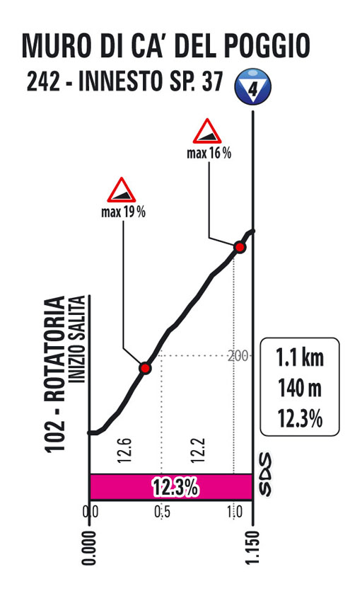 Dopo 24 km dalla partenza il primo GPM di giornata Le Scale di Primolano (2,3 km al 4,7%) mentre il primo sprint è posto a metà gara a Valdobbiadene; seconda scalata di giornata rappresentata dal famosissimo Muro di Cà del Poggio (1100 metri al 12,3%) che anticipa il secondo e ultimo “TV” di giornata, quello di Susegana.