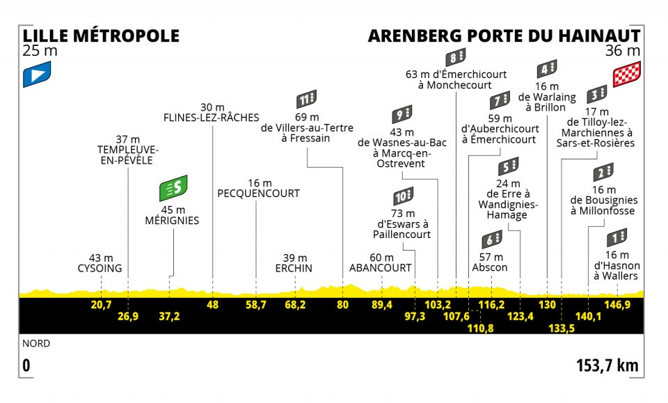 Dopo la partenza da Lille il gruppo raggiungerà velocemente lo sprint volante di Mérignies prima di entrare nella fase calda della giornata con il primo degli undici tratti in pavè. Si inizia con il Villers-au-Tertre à Fressain (+++, 1400 m) al km 81; dopo 17 km il secondo tratto, uno dei più facili, quello di Eswars à Paillencourt (++, 1600 m).