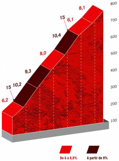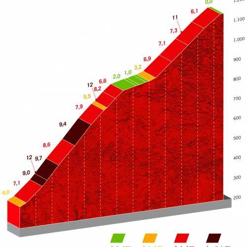 Quasi trenta chilometri di pianura prima di incontrare una salita, anche questa non è GPM, l’Alto de Hijas (3900 metri al 7%) che avvicina il plotone al finale di gara che prevede la Collada de Brenes (6800 metri all’8,2%), con diversi tratti in doppia cifra e una pendenza massima del 15%, e la salita finale che porta ai 1134 metri di altitudine del San Miguel de Aguayo; una salita di 12,6 km con una pendenza media del 6,5% con la prima parte di salita in cui si trovano le pendenze più dure di tutta l’ascesa.