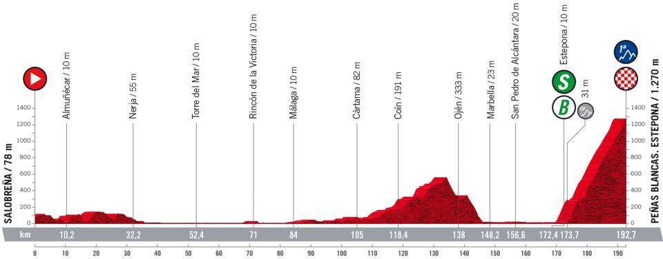 Tutto molto semplice per i primi 119 km quando il gruppo arriva a Coin dove inizia un tratto di strada che tende a salire anche con una discreta pendenza in qualche tratto. Terminata questa parte di corsa si ritorna in pianura fino al traguardo volante di Estepona dove inizia immediatamente l’erta finale che porta lungo l’arrivo di Peñas Blancas.