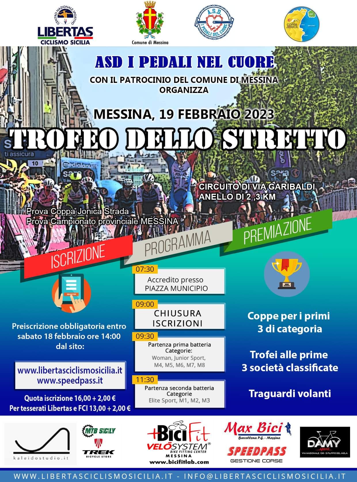 Continua la Coppa Jonica di ciclismo su strada Libertas con il Trofeo dello Stretto in programma domenica 19 febbraio a Messina, gara valida anche per il Campionato Provinciale Messina, sempre dell’ente di promozione sportiva Libertas. La manifestazione sportiva organizza dalla Asd affiliata Libertas, I Pedali del cuore, conferma l’inizio con i botti per il ciclismo su strada Libertas, che vede ancora una grande partecipazione in termini numerici, nonostante altre gare riservate al circuito master siciliano in programma lo stesso giorno a Palermo. Saranno in 165 con partenza alle ore 9.30 da Piazza Municipio a contendersi le due batterie (Under ed Over 45). Un circuito cittadino in pieno centro a Messina che ritorna dopo qualche anno di stop, a causa della presenza di dossi lungo i due viali paralleli di Via Garibaldi. In tutto 2.3 km, con l’arrivo leggermente in salita, da ripetere 25 volte per gli Over 45 e 30 gli Under. Assenti Di Salvo ed Analfino tra gli under 45, occhi puntati su Nicola Genovese del Team Rossoazzurri. Il catanese dopo il secondo posto al Trofeo Sant’agata si è imposto a Palermo al circuito della Favorita. A rovinargli la festa potrebbe essere uno tra Enrico Dimartino (Robur Barcellona) e Gianpaolo Pappalardo (Iron Bike). Tra gli Over diversi coloro che potrebbero puntare al podio più alto. Salvo Coco (Rossoazzurri) è stato sempre in evidenza sia a Catania che a Palermo, mentre Gianluca Pullano (Gioventù Pacese)ha già brindato nella gara di apertura a Catania aggiudicandosi il suo terzo Trofeo Sant’Agata. Marco Compagnini (Rossoazzurri), Ivan Alibrandi (Robur Barcellona) e Angelo Mortillaro (ThetaBike) completano il ventaglio dei pretendenti alla vittoria. Diretta streaming su Sport Web Sicilia a partire dalle 9.30