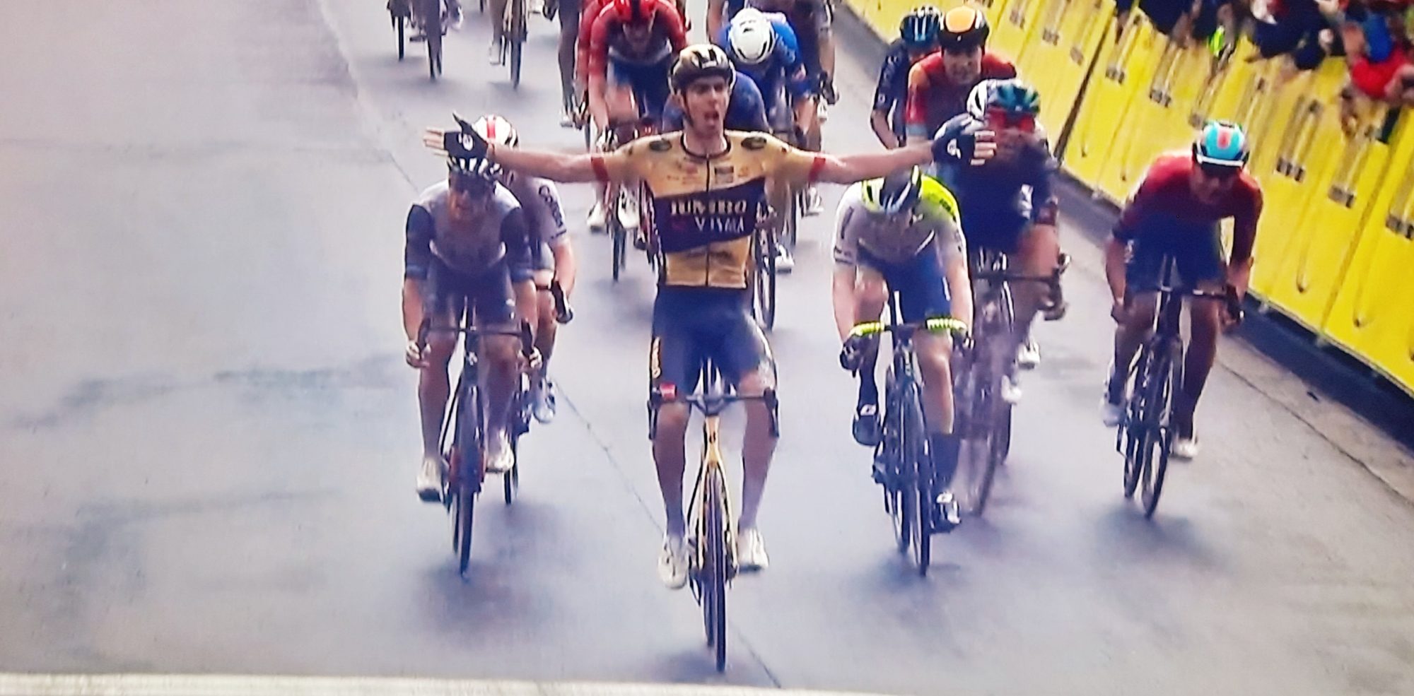 Tra gioia, dolore e crudeltà: tutto questo è nell’arrivo della prima tappa del Delfinato vinta da Christophe Laporte in un arrivo di drammatica e crudele bellezza con l’uomo in fuga Herregodts ripreso incredibilmente a soli quaranta metri dall’arrivo. Insomma per il belga a pochi metri dall’arrivo é come aver sbattuto… Laporte in faccia. Frazione di 157,7 km con partenza e arrivo a Chambon-sur-Lac e sui ciclisti di abbatte la furia di Pluvio. Pioggia dall’inizio alla fine della tappa che di conseguenza viene condizionata. La fuga di giornata è franco-belga e sono in cinque: i transalpini Donavan Grondin (Team Arkéa-Samsic) e Dorian Godon (AG2R Citroën Team) e i belgi Rune Herregodts (Intermarché-Circus-Wanty), Brent Van Moer (Lotto Dstny), Fabio Van den Bossche (Alpecin-Deceuninck). Intanto la fuga perde un pezzo pregiato, Hayter della Ineos-Grenadiers dopo ben due cadute si ritira. Donavan Grondin e Fabio Van den Bossche si staccono dal gruppo dei fuggitivi che restano in tre. A tirare il gruppo è la Bora-Hansgrohe per Sam Bennet, il ritardo ai -35km è di 2’02”. Ai -20km il forcing del gruppo è guidato da Attila Valter che fa una selezione micidiale: a farne le spese Cavagna e tanti velocisti tra cui Groenewegen. I fuggitivi vengono ripresi, tranne Herregodts che mantiene 15″ secondi sino ai -2km. Poi la strada sale leggermente, il gruppo guidato dalla Jumbo alza il ritmo e raggiunge Herregodts e vince. Trentin secondo. Terzo l’eroe del giorno: per il belga Herregodts tanta amarezza per quei maledetti quaranta metri.
