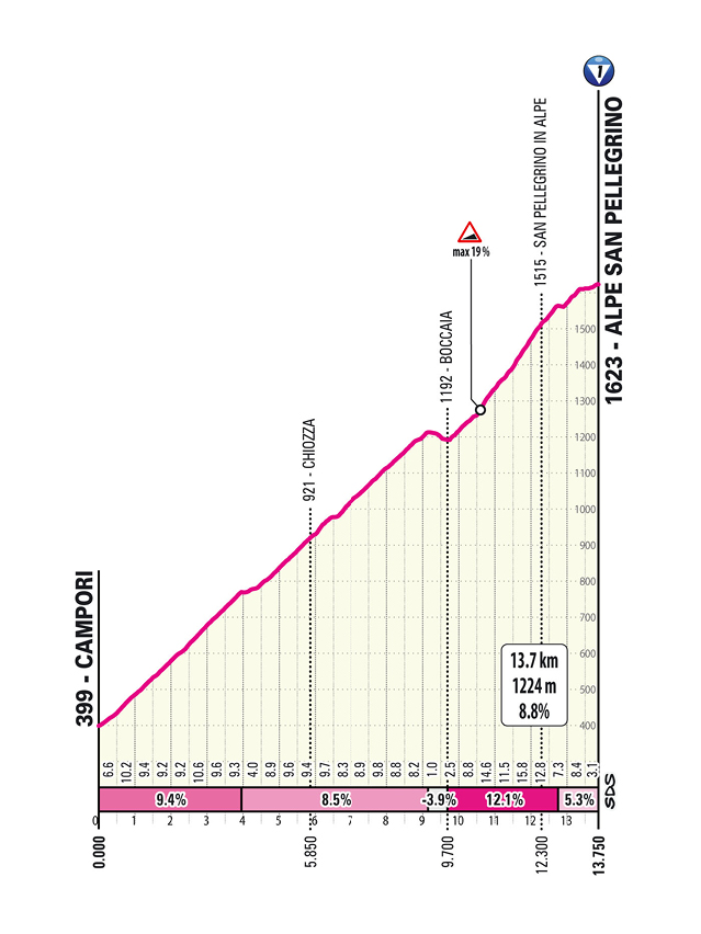 Il San Pellegrino in Alpe misura 13,7 km e una pendenza media dell’8,8%; primi 4 km con una pendenza media del 9,4%, successivamente 5 km all’8% prima di una breve discesa che anticipa il tratto più duro della salita, subito dopo Boccaia, di quasi 3000 metri e una pendenza media del 12,1% e una pendenza massima del 19%. Una salita vera ma lontano dal traguardo di Castelnovo ne’ Monti.