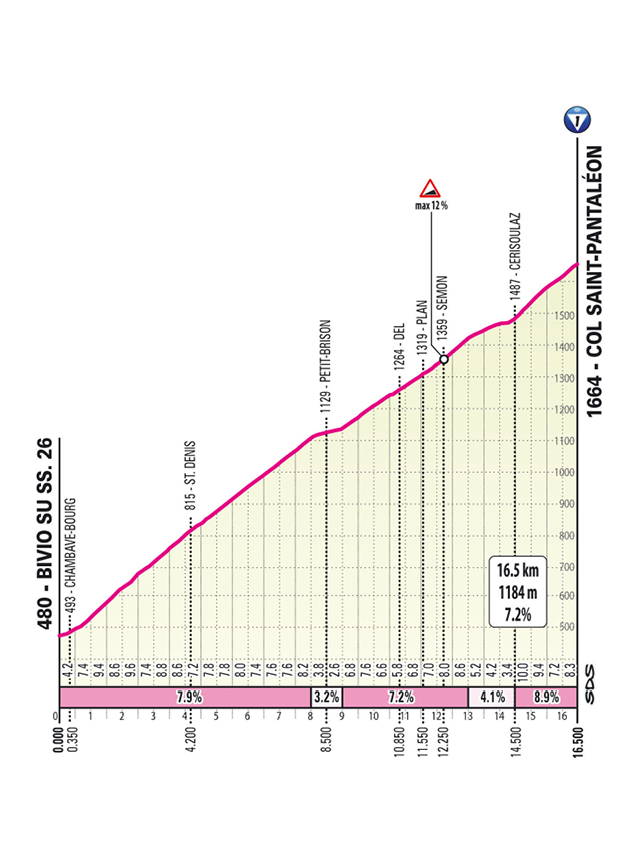 12 km di discesa e successivo tratto pianeggiante che condurranno la corsa al km 87,3 dove è posto il secondo e ultimo sprint di giornata quello di Châtillon che anticipa di qualche chilometro l’inizio della terza salita della giornata. Siamo a Chambave e proprio qui si salirà per 16, 5 km al 7,2% fino ad arrivare ai 1664 metri del Col Saint-Pantaléon; salita lunga anche questa ma molto più regolare.
