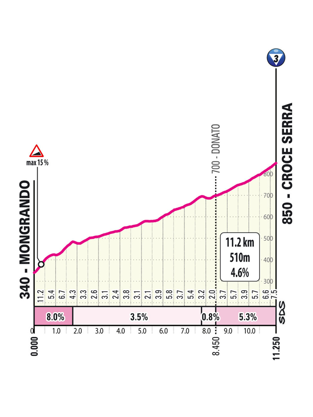 Discesa verso Borgofranco d’Ivrea e tratto in pianura con il primo sprint posto a Pont-Saint-Martin al km 36,8; arrivati a Verrès la strada ricomincia a salire verso il Col Tzecore lunga ascesa di 16 km al 7,7% di pendenza media ma con un tratto vicino allo scollinamento di 3400 metri dove la pendenza media è dell’11,4%. Salita che può già logorare le gambe stanche dei big della classifica generale.