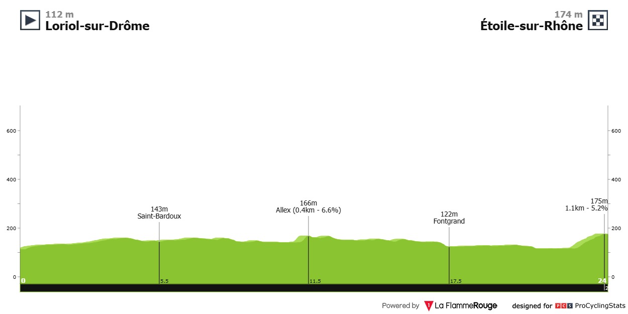 24 km in programma con partenza da Loriol-sur-Drôme e arrivo in leggera salita a Étoile-sur-Rhône. Si tratta di una prova contro il tempo prevalentemente pianeggiante ma che prevede due brevi strappi; il primo al km 11,5 ad Allex di circa 400 metri alla pendenza media del 6.6%, il secondo è quello che conduce sulla linea del traguardo di 1100 metri al 5,2%.