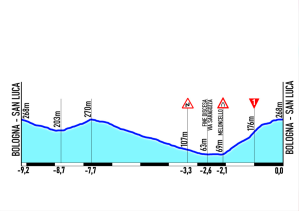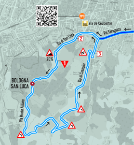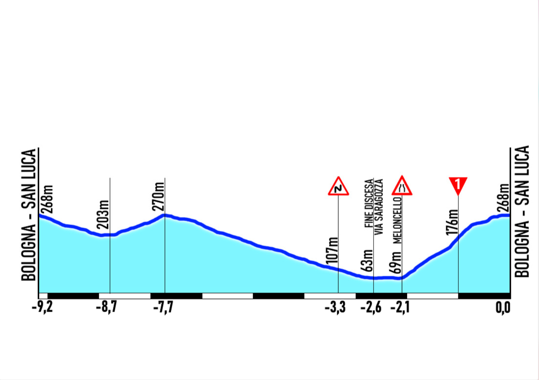 A circa 40 km dall’arrivo la corsa entra a Bologna dove la corsa entra nel vivo con i cinque passaggi sul San Luca una breve salita, iconica e protagonista spesso al Giro d’Italia, di 1900 metri con una pendenza media del 10,4% e una punta massima del 18% nella famosa curva delle orfanelle.