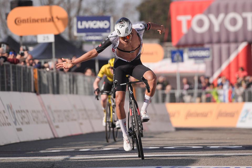 L’azione del britannico sembra quella decisiva fino a quando, superata la flamme rouge, si muove Del Toro che nel giro di 150 metri rientra sul britannico e vince di potenza la volata a due con Martinez che terzo davanti ad Egan Bernal e a Primoz Roglic (Red Bull – BORA – hansgrohe).