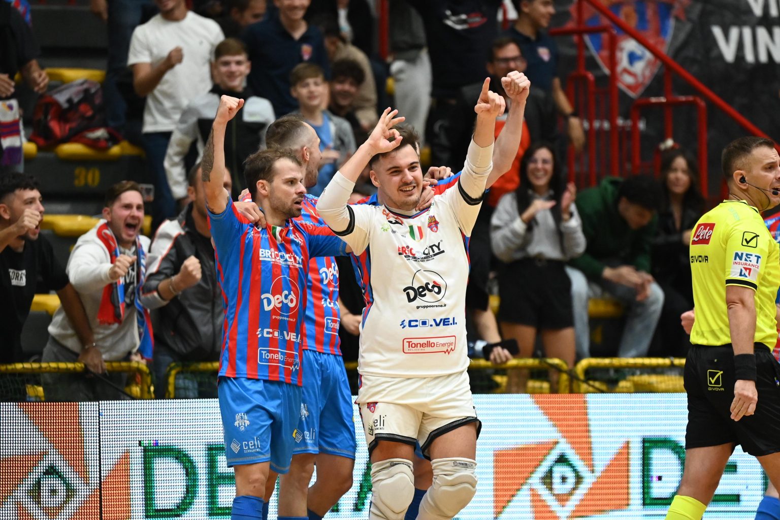 La Covei Meta Catania Bricocity resta a punteggio pieno. I bi-campioni d’Italia fanno festa nella prima gara casalinga della stagione, battendo 5-4 l’Ecocity Genzano all’ultimo respiro. Al PalaCatania decide il gol di Pulvirenti a 30″ dallo scadere. Straordinaria doppietta di Turmena. Nonostante le assenze di Carmelo Musumeci, Timm e Dian Luka e il cartellino rosso a Bocão, la Meta si prende l’intera posta ed è nel terzetto al comando della classifica, a quota 6 dopo due giornate, insieme a Feldi Eboli e Active Network.