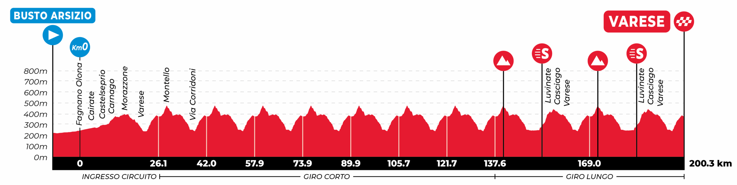 Partenza da Busto Arsizio e arrivo a Varese dopo 200,3 km e ben 3377 metri di dislivello. Il percorso dopo il primo tratto in linea do 26 km è diviso in tre circuiti; il primo di circa 16 km da ripetere sette volte con la salita dei Ronchi (2800 metri al 5,2%, massima del 12%) e il Montello (1000 metri al 6,6%).
