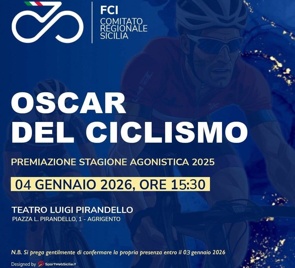 Il grande ciclismo siciliano si ritrova ad Agrigento per celebrare i suoi protagonisti. Domenica 4 gennaio 2026, a partire dalle ore 15:30, la splendida cornice del Teatro Pirandello ospiterà l’Oscar del Ciclismo, l’evento annuale organizzato dal Comitato Regionale della Federciclismo Sicilia per premiare le eccellenze della stagione appena conclusa. Sarà un pomeriggio di festa dedicato a tutte le categorie, dai giovanissimi ai master, volto a valorizzare il movimento regionale e gli sforzi delle società affiliate.