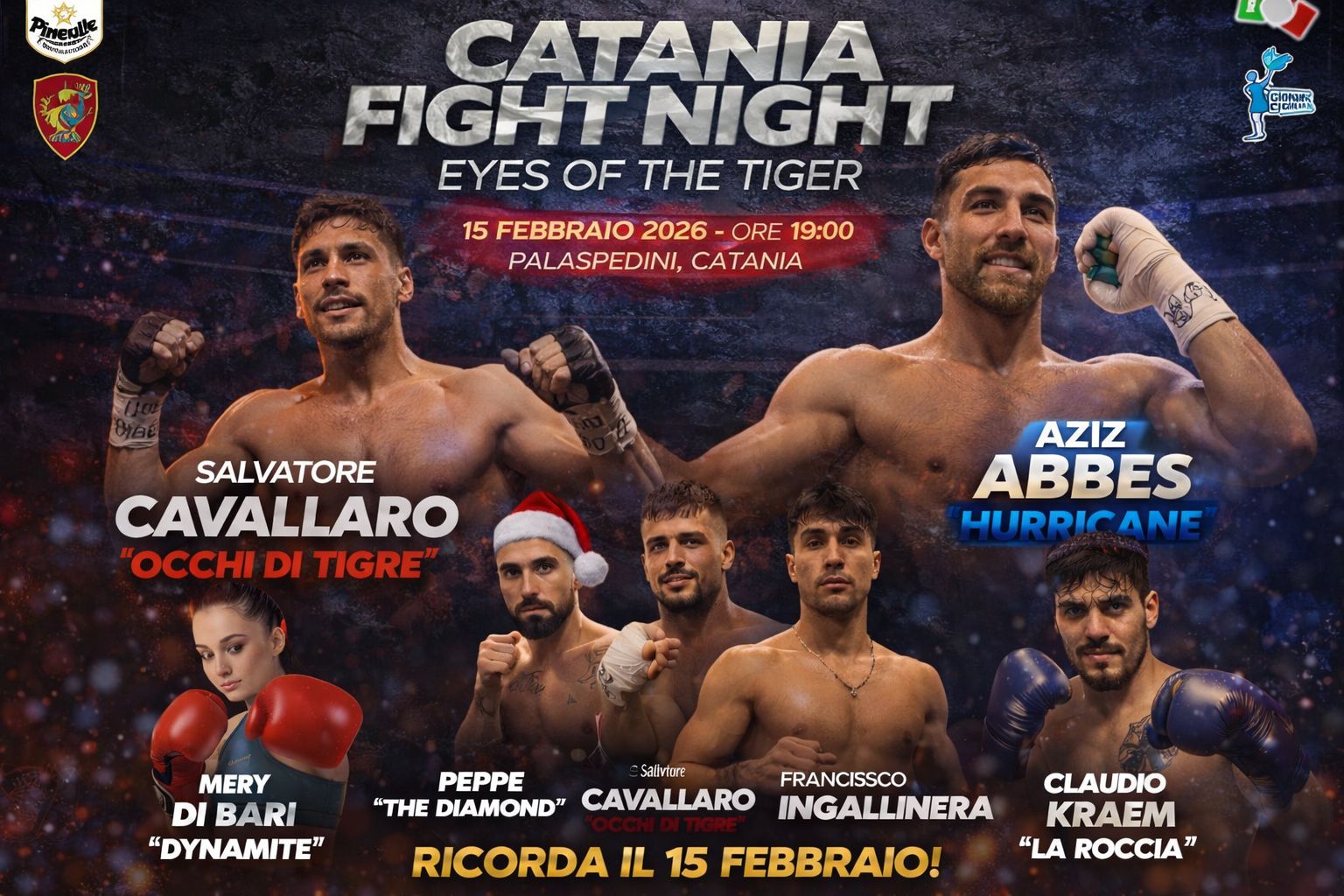 L’attesa per domenica 15 febbraio cresce. Sul ring, oltre a Salvatore Cavallaro “Occhi di Tigre”, saliranno i professionisti Aziz Abbes “Hurricane”, Mery Di Bari “Dynamite”, Peppe Rubino “The Diamond”, Francesco Ingallinera “Ciccio Inga” e Claudio Kraiem “La Roccia”.
