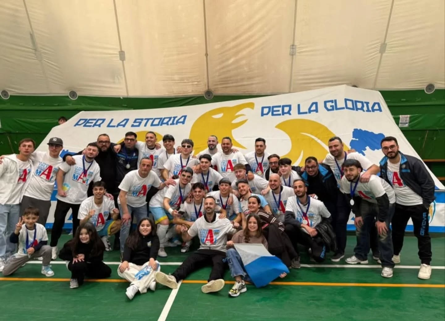 A come Adrano. Festa doveva essere e festa grande è stata. Il 13-0 rifilato all’Athletic Club Palermo consegna la promozione in A2 all’Adrano che con un turno d’anticipo corona una cavalcata esaltante. Nicolosi (2), Cavallaro, Famà (2), Verzì, Bonaccorso, Papotto (2), Licandri e Finocchiaro (3) firmano la goleada alla Tensostruttura comunale. Pubblico in delirio e tante bandierine biancazzurre per celebrare un traguardo storico, tra gioia ed un pizzico di commozione, in campo e sugli spalti. In diciannove gare gli etnei di coach Carmelo Sgroi hanno collezionato 43 punti nel girone H di Serie B, frutto di 14 vittorie, un pareggio e 4 sconfitte, con 143 gol fatti (miglior attacco) e 72 subiti. I numeri del dominio. Un ruolino di marcia inarrestabile per le rivali. La Nausicaa, seconda in classifica (6-0 a tavolino contro il Viagrande), è staccata di un punto, ma ad incontri già ultimati, dovendo riposare all’ultima giornata. La rosa completa dell’Adrano: Marino, Bonaccorso, Carini, Famà, Papotto, La Monica, Finocchiaro, Nicolosi, Pereira, Verzì, Licandri, Cavallaro, Giappone, Furnari. Il club dei presidenti Carmelo Perni, Maurizio Russo e Tuccio Testa tocca adesso il cielo con un dito, volando in un campionato nazionale, giusto premio dopo un percorso di crescita costante.