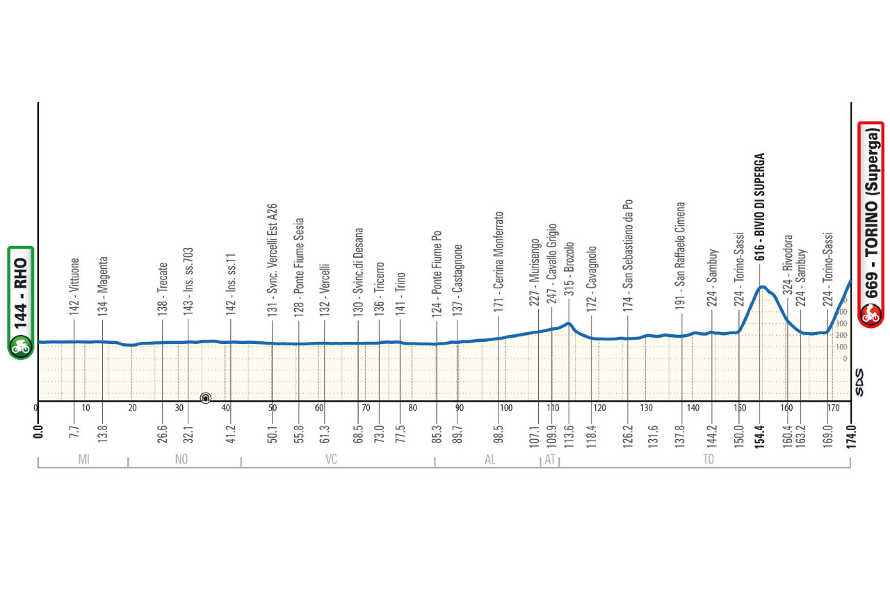 La gara si svilupperà lungo un tracciato che avrà una prima parte veloce e una seconda metà dedicata agli scalatori puri. La partenza avverrà da Rho, con i corridori che attraverseranno l’alta pianura padana lungo strade pianeggianti e rettilinee. A Magenta, Novara e Vercelli, il gruppo solcherà la zona delle risaie fino a raggiungere le sponde del Po per entrare nella provincia di Torino dove il ritmo della corsa è destinato a cambiare drasticamente.
