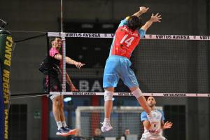 L’avvio è shock per i ragazzi di coach Paolo Montagnani. Aversa parte con un forcing asfissiante (5-0) che mette subito a nudo le difficoltà in ricezione dei rossazzurri. Il primo set scivola via senza troppi sussulti, chiuso da un muro di Mattei sul 25-17.