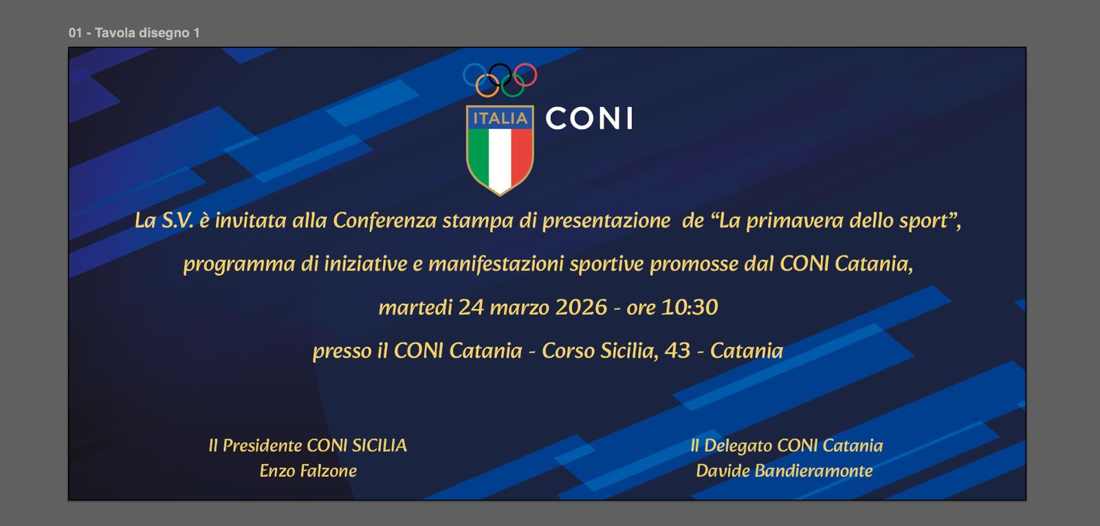 La presentazione ufficiale del programma si terrà martedì 24 marzo 2026 alle ore 10:30 presso la sede del Coni di Catania, in Corso Sicilia 43, durante una conferenza stampa alla quale interverranno il presidente del CONI Sicilia, Enzo Falzone, e il delegato Coni Catania, Davide Bandieramonte.