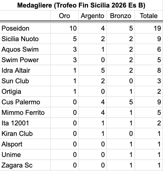 Nel medagliere la Poseidon si conferma al primo posto come numero di ori e numero di podi totali. Seconda piazza per la Sicilia Nuoto che guadagna una posizione rispetto alla classifica di società. Per il terzo posto duello tra Aquos Swim e Swim Power, entrambe le società conquistano tre ori, la gli etnei hanno un argento in più, l’unico tra l’altro. Fuori dal podio buon bottino per Idra Altair, otto medaglie, e Cus Palermo, nove podi in tutto ma nessuno oro.