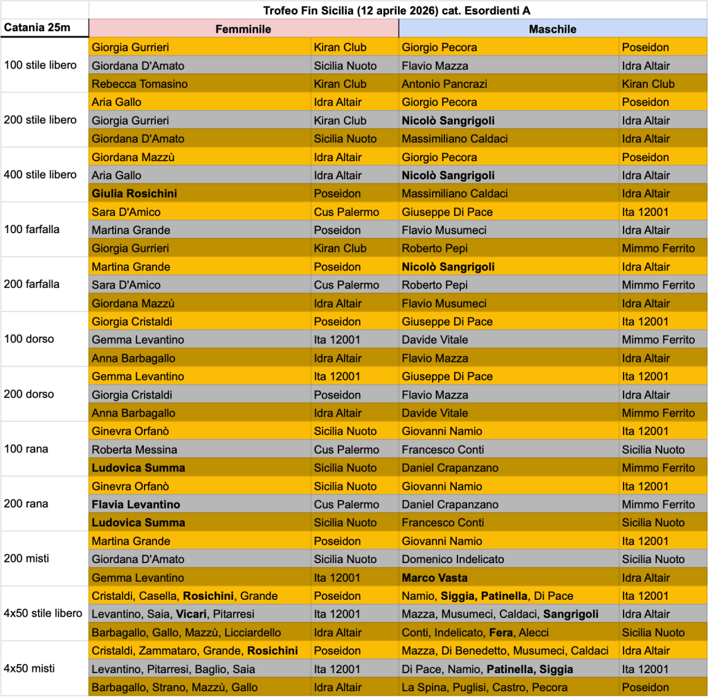 Questi i podi della manifestazione svoltasi domenica 12 aprile. In un articolo successivo celebreremo i medagliati e analizzeremo i tempi nuotati dagli Esordienti A nell’ultimo appuntamento in vasca da 25 metri della stagione.