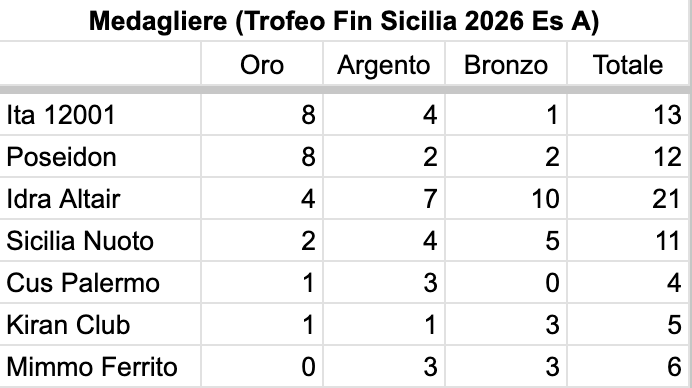 Classifica di società che vedo solo 13 squadre andare a punti e nel medagliere sono ancora meno le società che vanno sul podio. Quanto a podi totali, confermando il risultato della classifica di società, la prima è l’Idra Altair. La lotta nel medagliere però è un altro duello tra Ita 12001 e Poseidon, anche in questo caso la società etnea deve cedere per molto poco, due argenti, visto che gli ori tra le due formazioni erano in parità (otto).